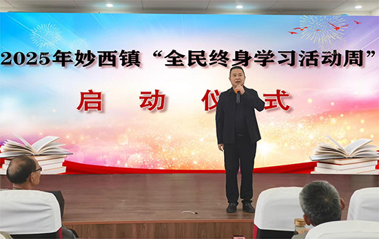 湖州市妙西鎮(zhèn)成人文化技術(shù)學(xué)校校長(zhǎng)朱春明作動(dòng)員講話。他指出,終身學(xué)習(xí)是賦能鄉(xiāng)村振興的重要支點(diǎn),是邁向共同富裕的精神航道;期盼家家戶戶“開(kāi)卷有益”,讓書香與煙火氣相融相伴,讓“學(xué)在妙西”成為最鮮亮的共富底色。