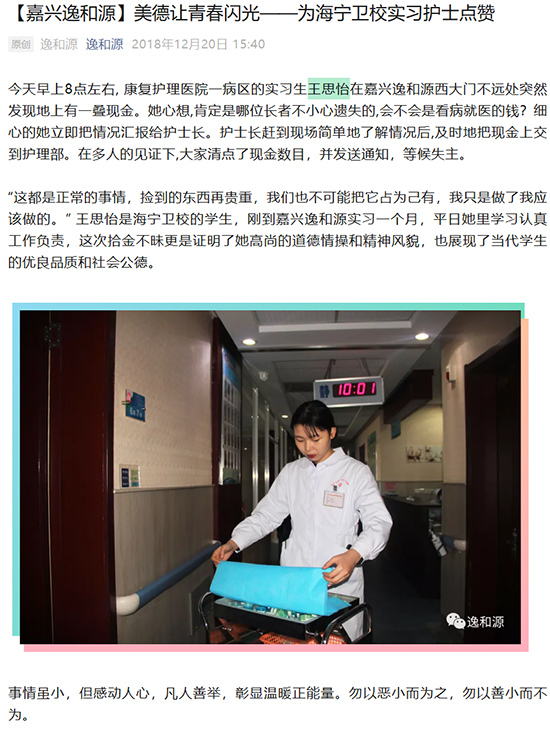 武于路和沈佳妮同學拾金不昧的行為,也是學校長期以來注重立德樹人的生動體現。在黨政班子的有力領導下,學校始終堅持“育人育才并舉,育才先育人”理念,將德育貫穿于教育教學的全過程,培養(yǎng)“勤于學習、精于操作、善于溝通、甘于奉獻”的海衛(wèi)天使。健康所系,性命相托,學校從主題班會到校園文化活動,從課堂思政到社會實踐,無不浸潤著對學生品德修養(yǎng)的塑造。這一次的暖心事件,正如之前公交車上教科書式救人的華智宇、商場里施救急癥病人的凌琴琴、街頭對倒地老人展開急救的孫晶晶與孫潔、實習醫(yī)院里拾金不昧的王思怡、實習崗位上以精湛技能貼心護理感動病人的張輝和楊瀅瀟……一個個美麗的天使的涌現,正是學校育人成果的生動縮影。