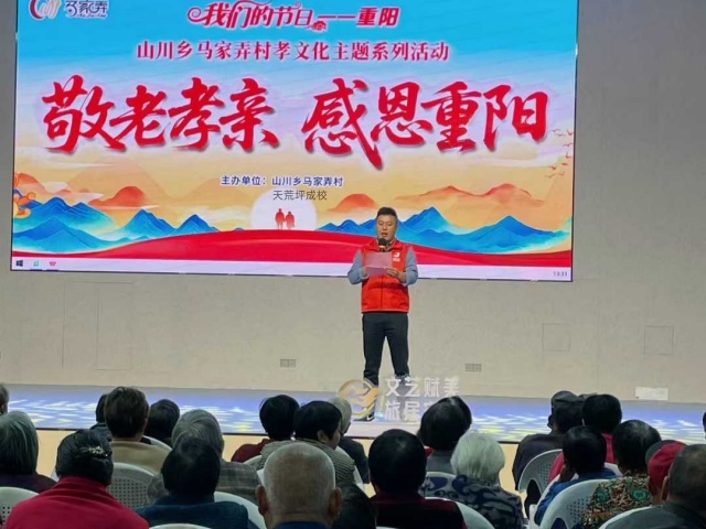 活動(dòng)現(xiàn)場,“敬老孝親 感恩重陽” 的主題背景板格外醒目,遠(yuǎn)山、夕陽的畫面與 “孝” 文化主題相得益彰。馬家弄村和天荒坪分院的工作人員身著紅色志愿服,服務(wù)于會(huì)場周圍,馬家弄村支部書記丁爽在臺(tái)上深情致辭,向全村老人致以節(jié)日的祝福,他表示:“孝親敬老是中華民族的傳統(tǒng)美德,馬家弄村始終將老人的幸福安康放在心上,希望通過這樣的活動(dòng),讓孝文化在村里代代傳承。”