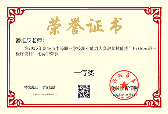 近日,2025年嘉興市中等職業(yè)學(xué)校職業(yè)能力大賽教師技能類“Python語言程序設(shè)計(jì)”項(xiàng)目比賽在嘉興技師學(xué)院圓滿落幕。經(jīng)過緊張激烈的角逐,嘉善信息技術(shù)工程學(xué)校潘旭辰教師憑借深厚的編程功底、扎實(shí)的教學(xué)基本功與創(chuàng)新的課堂設(shè)計(jì),從全市眾多參賽教師中脫穎而出,榮獲一等獎(jiǎng)(第二名),成功晉級省賽!