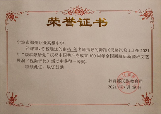 近日,寧波市鄞州職業(yè)高級中學(xué)收到教育部民族教育司寄送的證書,該校楊劍老師帶領(lǐng)西藏學(xué)生創(chuàng)作的舞蹈《天路汽修工》在2021年“頌歌獻(xiàn)給黨”慶祝中國共產(chǎn)黨成立100周年全國西藏班新疆班文藝展演(視頻評比)活動中獲得一等獎。