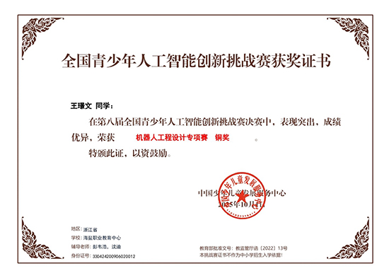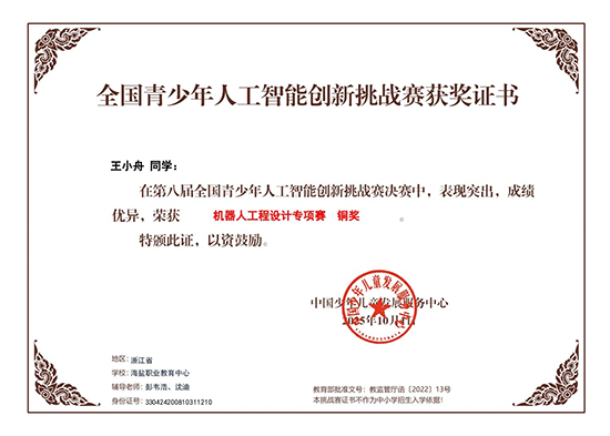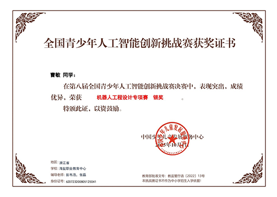 近日,第八屆全國青少年人工智能創(chuàng)新挑戰(zhàn)賽全國總決賽圓滿落幕。海鹽職業(yè)教育中心曹敏、王璟文、王小舟學(xué)生團(tuán)隊再度載譽而歸,榮獲一銀、二銅的優(yōu)異成績!