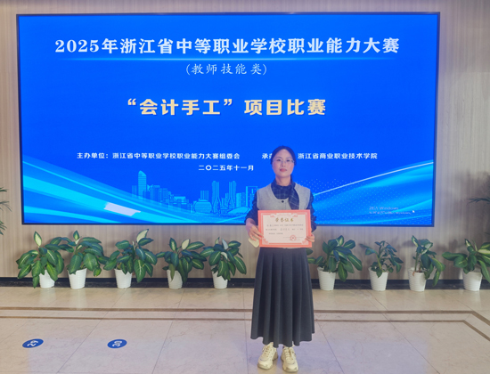 在2025年11月1日至2日舉辦的“2025年浙江省中等職業(yè)學(xué)校職業(yè)能力大賽(教師技能類)會計手工項目”中,蒼南縣職業(yè)中等專業(yè)學(xué)校鄭燕子老師憑借扎實的專業(yè)功底和出色的現(xiàn)場表現(xiàn),在激烈競爭中脫穎而出,榮獲省級一等獎。